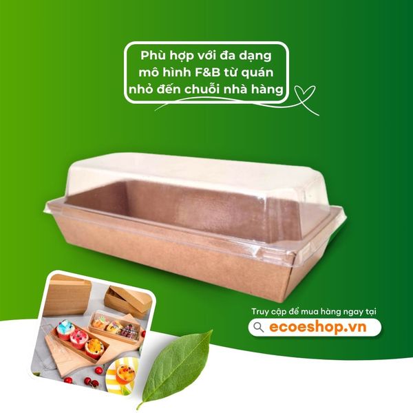 Hộp giấy vuông kraft nắp PET là loại hộp được làm từ chất liệu giấy kraft với màu sắc nâu tự nhiên, được thiết kế với hình vuông kèm theo nắp PET. Điểm nổi bật của sản phẩm là phần nắp trong suốt giúp khách hàng dễ dàng nhìn thấy thực phẩm bên trong mà không cần mở hộp. Điều này không chỉ tăng thêm tính thẩm mỹ mà còn đảm bảo vệ sinh và an toàn cho món bánh bông lan cuộn. Nắp PET cũng có độ bền cao, khả năng chịu lực tốt, không lo bị méo mó trong quá trình vận chuyển.