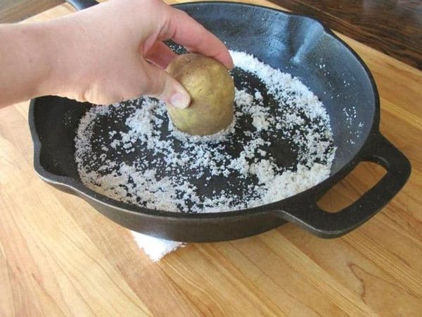 - Tẩy vết cháy chảo bằng muối và khoai tây