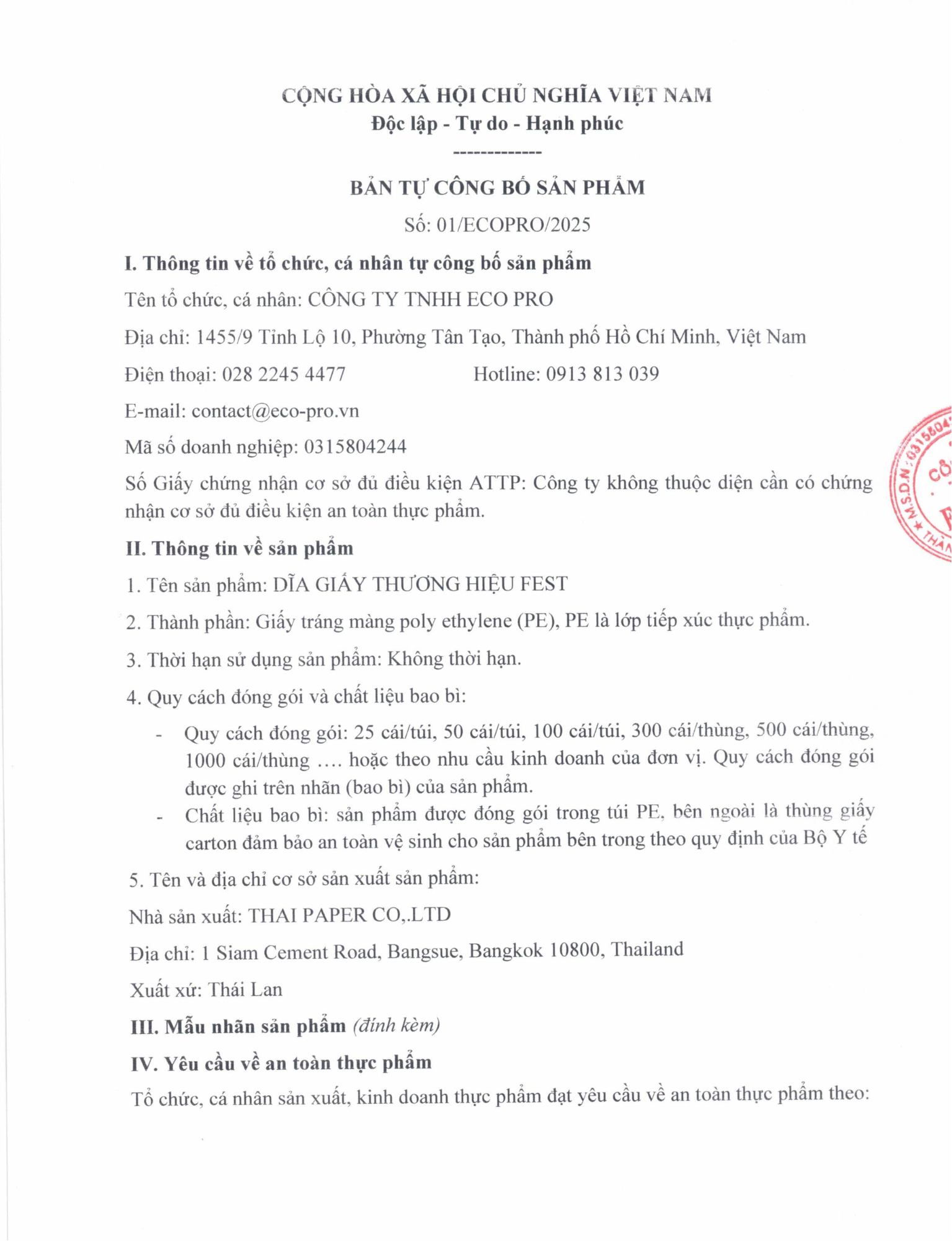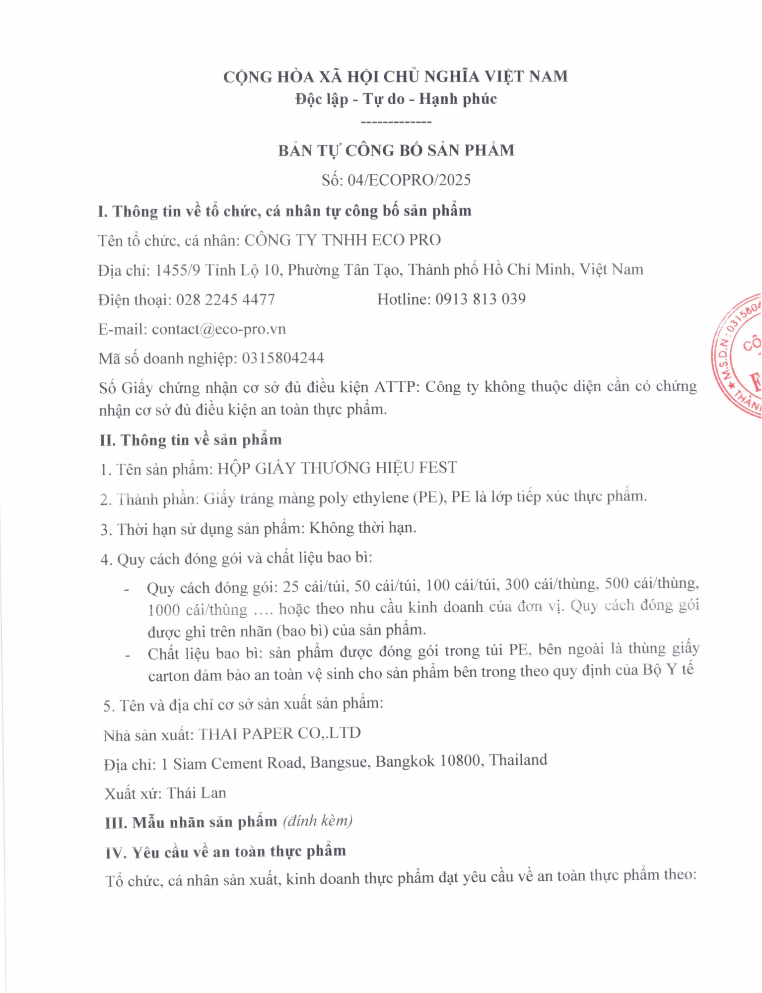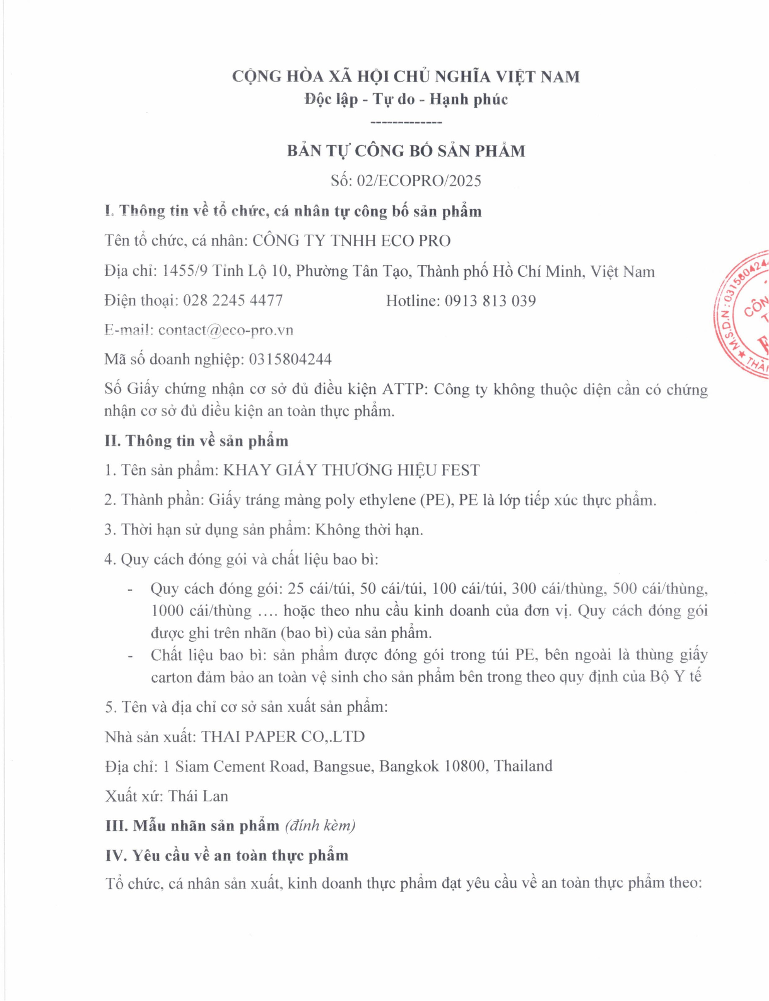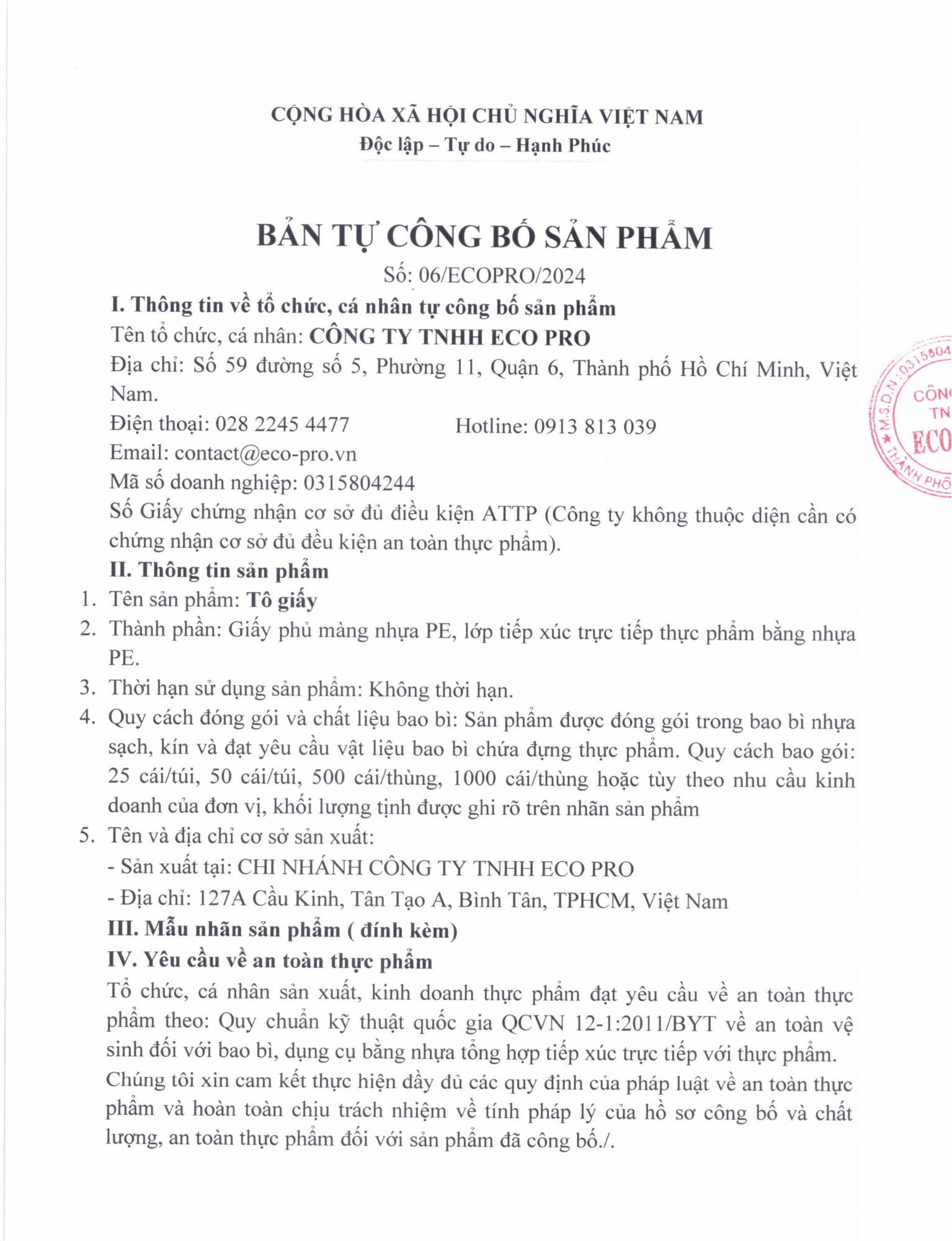 | CÔNG TY TNHH ECO PRO Đ/c: 1455/9 Tỉnh lộ 10, Tân Tạo, TPHCM Mã số thuế: 0315804244 Điện thoại: 028 2245 4477 |