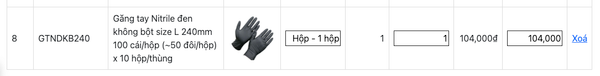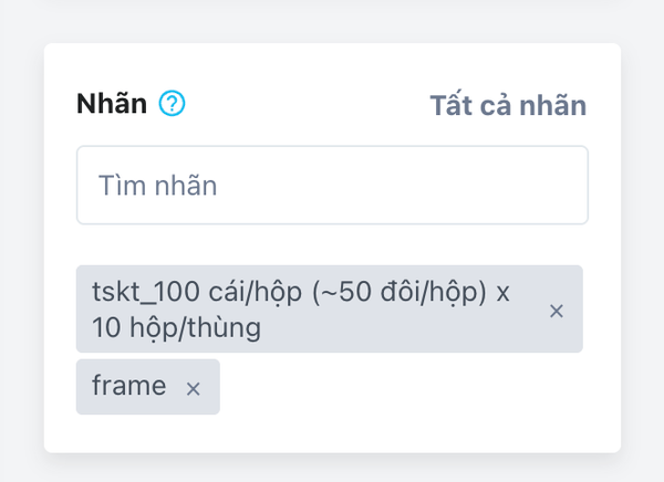 Ví dụ sản phẩm Găng tay Nitrile đen không bột size L 240mm, anh chị muốn gắn thêm thông số "100 cái/hộp (~50 đôi/hộp) x 10 hộp/thùng", anh chị sẽ gắn tag như sau: tskt_100 cái/hộp (~50 đôi/hộp) x 10 hộp/thùng