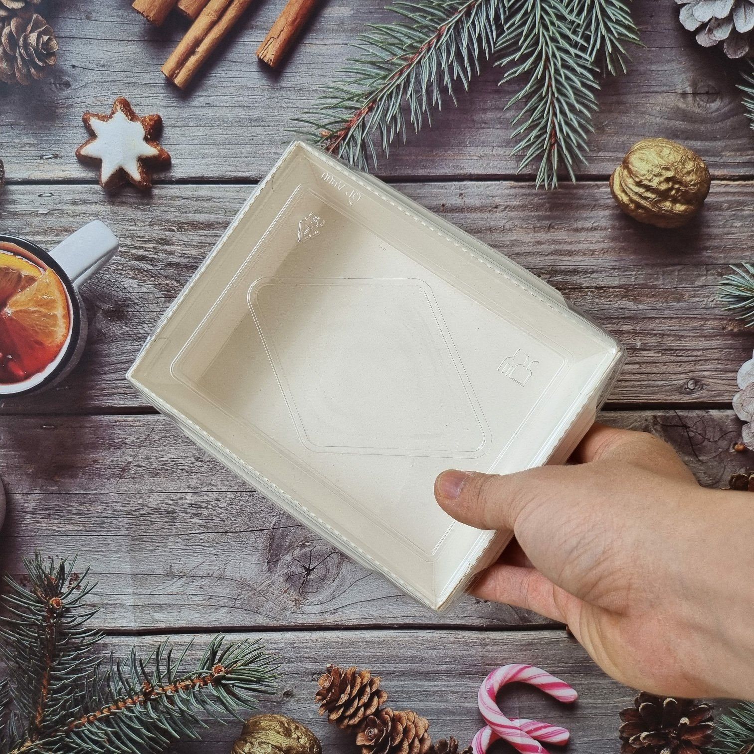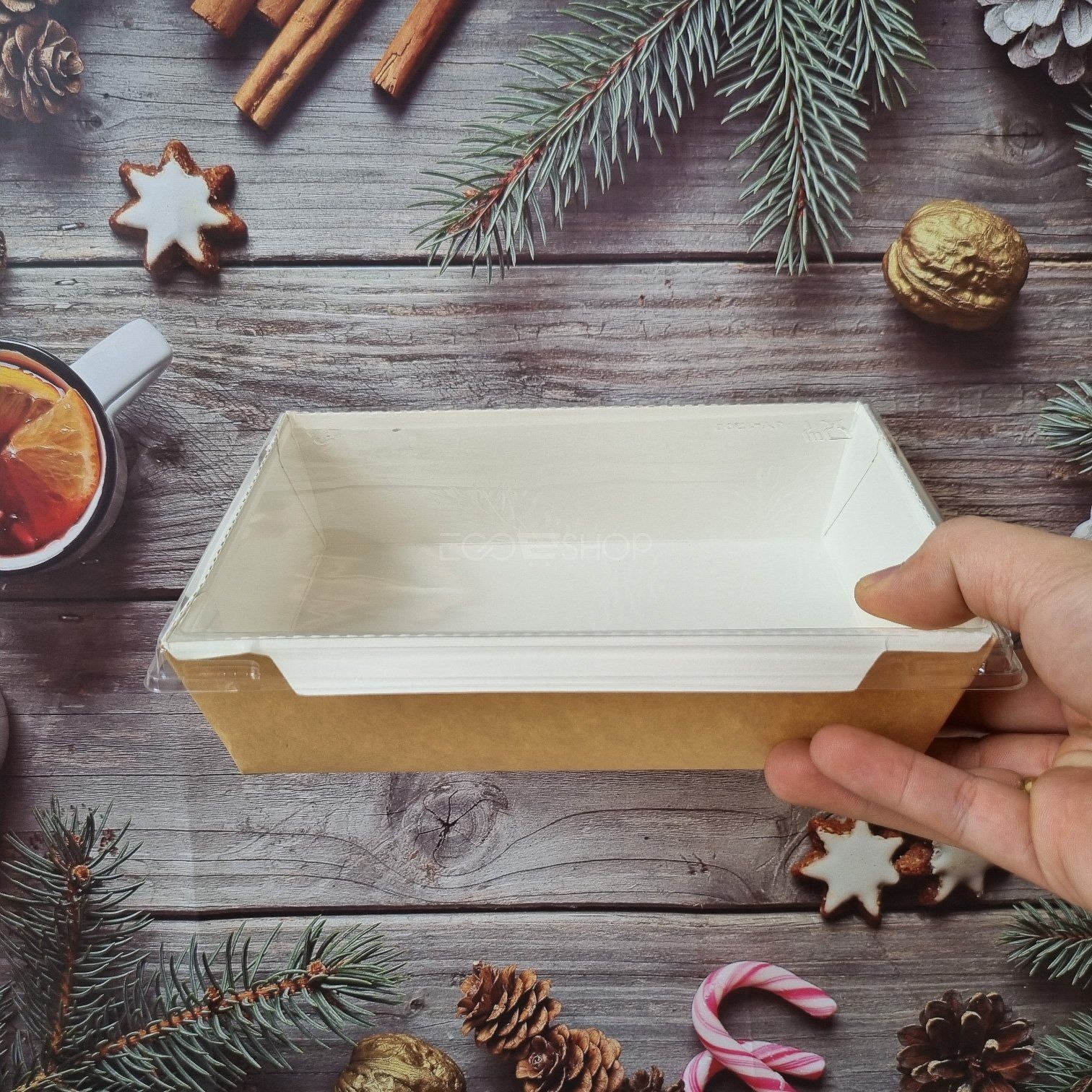 Chất liệu | Giấy tiếp xúc thực phẩm, nắp PET trong |