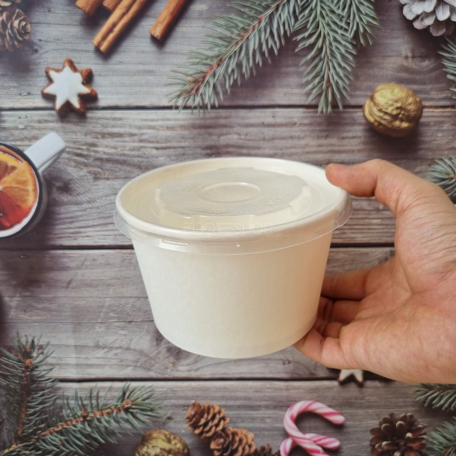 - Chất liệu: giấy thực phẩm, định lượng 280gsm tráng PE 1 mặt + nắp PP
